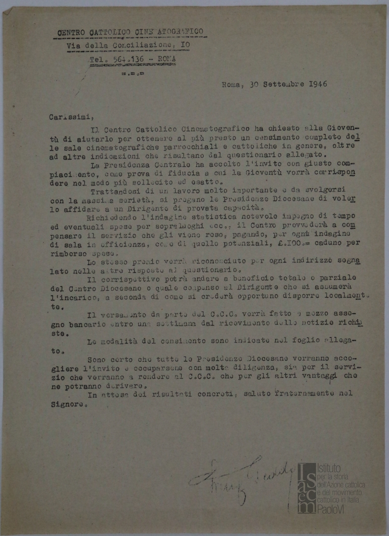 Lettera di Lettera di Luigi Gedda, presidente del Centro cattolico cinematografico - CCC, a destinatari non indicati
