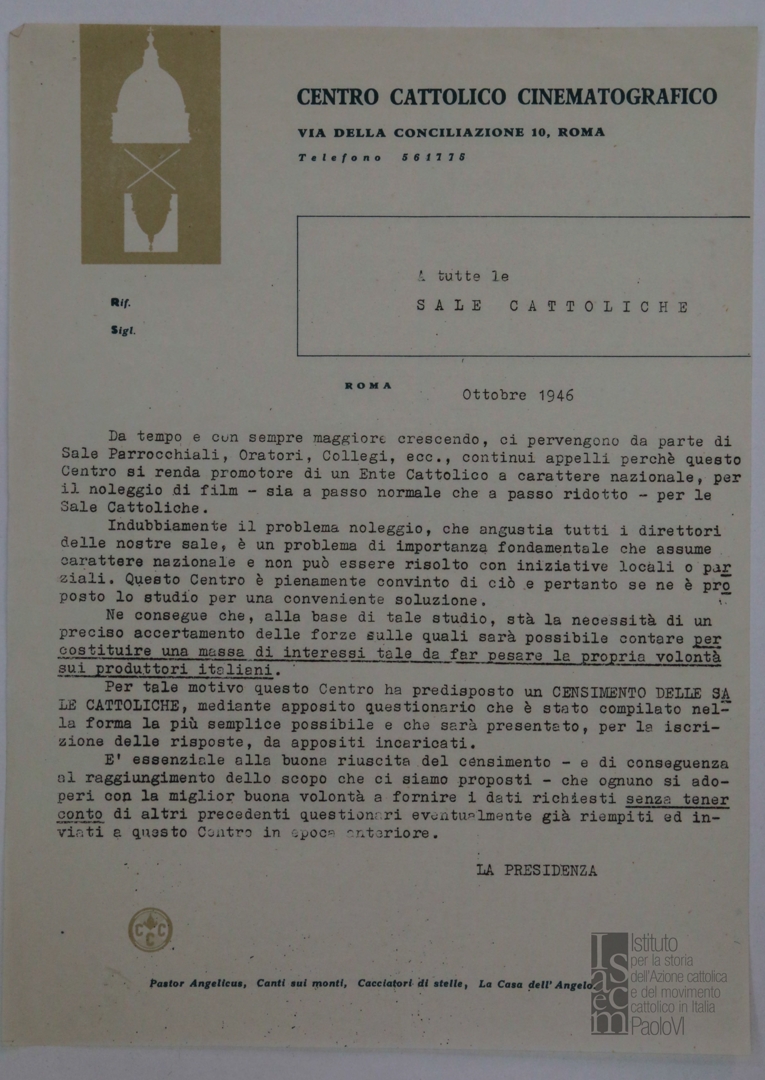 Questionario. Con lettera di trasmissione della Presidenza del Centro cattolico cinematografico - CCC alle sale cattoliche. Dattiloscritto e a stampa