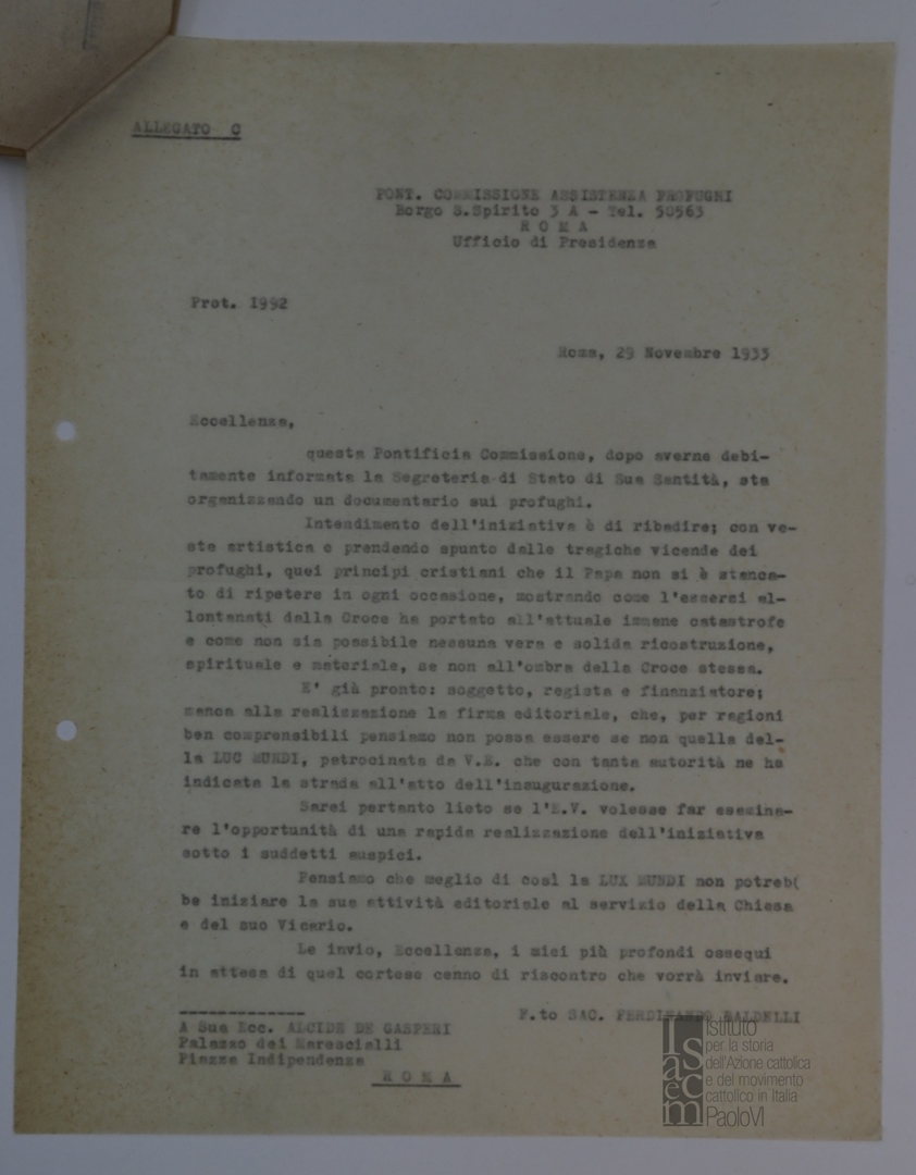 Don Ferdinando Baldelli chiede ad Alcide De Gasperi di intervenire presso la Lux Mundi per la realizzazione di un documentario sui profughi. Dattiloscritto