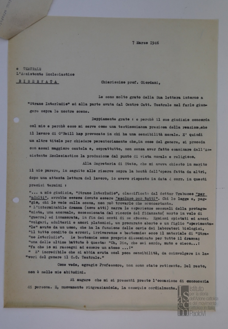 Mons. Ferdinando Prosperini ringrazia Roberto Giordani per il giudizio espresso sul lavoro teatrale "Strano Interludio" . Dattiloscritto