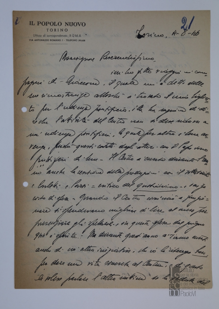 Lettera di Carlo Trabucco, su carta intestata de "Il Popolo Nuovo" di Torino, a destinatario non indicato