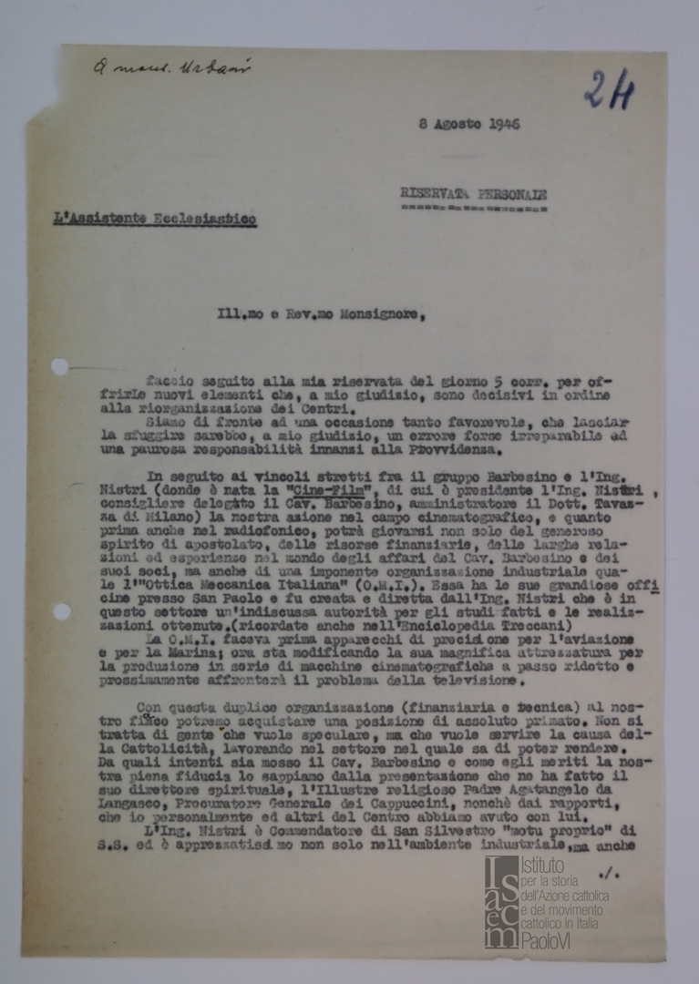 Lettera di Ferdinando Prosperini a mons. Giovanni Urbani, vescovo di Assume e assistente generale dell'ACI