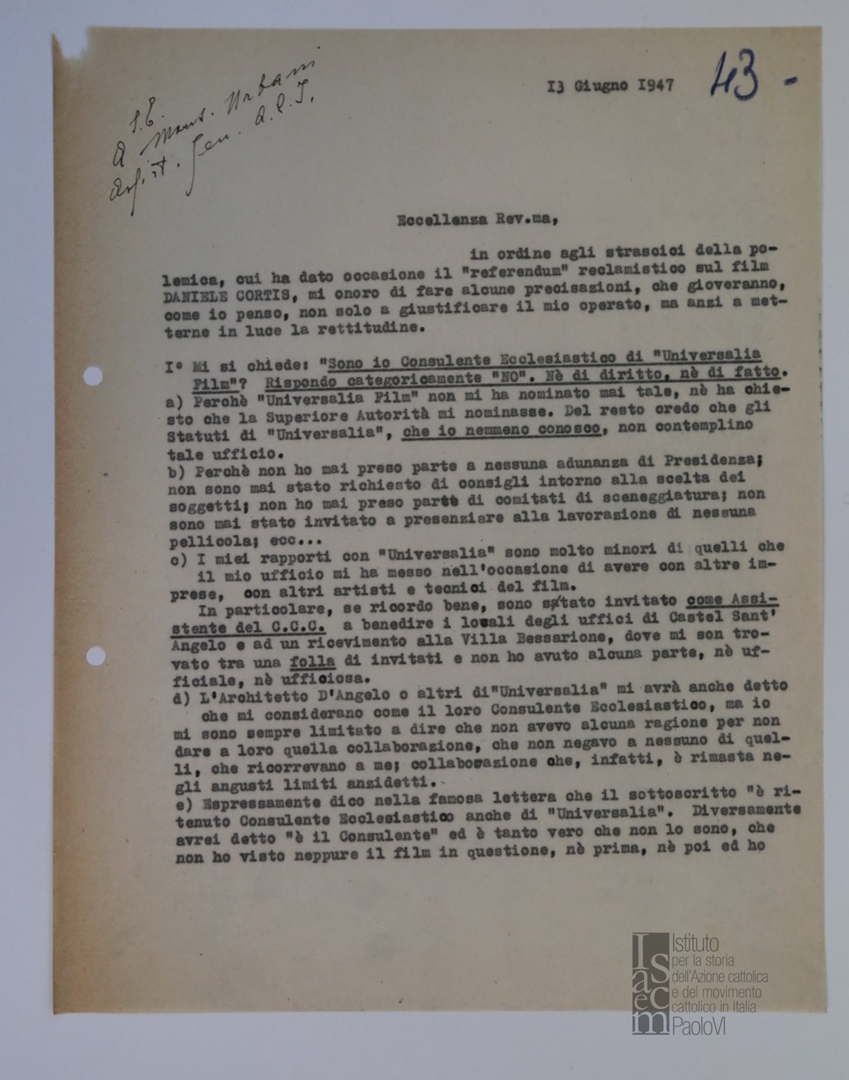 Ferdinando Prosperini scrive a mons. Giovanni Urbani per ribadire la sua estraneità all'operato di Universalia Film e alla realizzazione del film "Daniele Cortis". Dattiloscritto