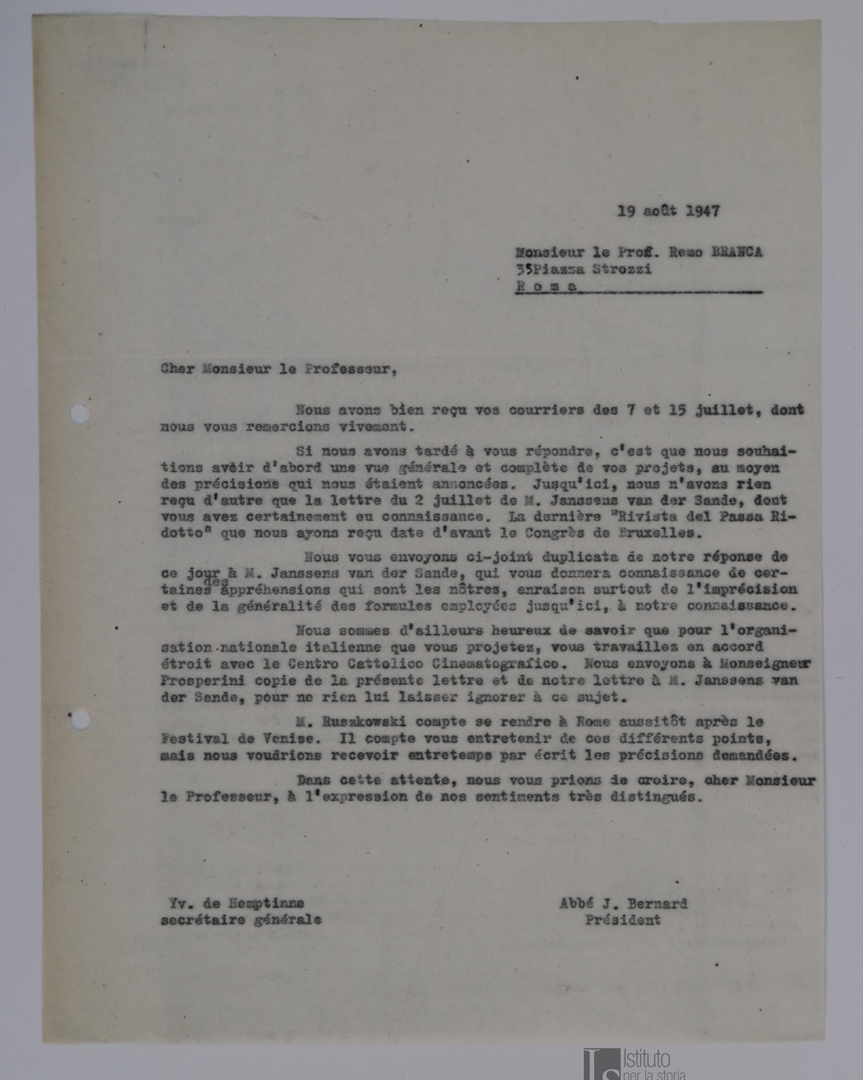 Jean Bernard e Yvonne de Hemptinne scrivono a Remo Branca a proposito dell'organizzazione italiana del cinema cattolico. Dattiloscritto