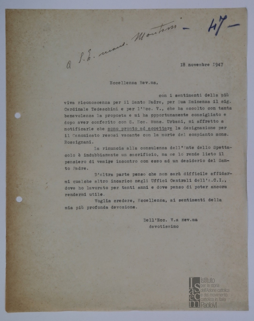 Mons. Ferdinando Prosperini comunica a mons. Giovanni Battista Montini di accettare la designazione per il Canonicato resosi vacante con la morte di mons. Rossignani. Dattiloscritto