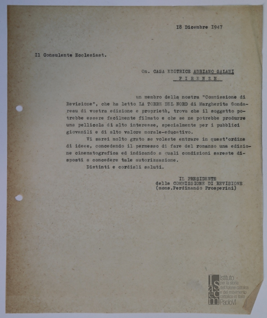 Ferdinando Prosperini chiede di poter utilizzare il romanzo La Torre del Nord di Margherita Goudareau, edito dalla Salani, come soggetto per un film educativo per i giovani. Dattiloscritto