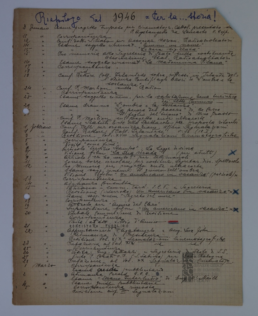 Resoconto della attività svolte nell'ambito dell'apostolato cinematografico. Appunto manoscritto