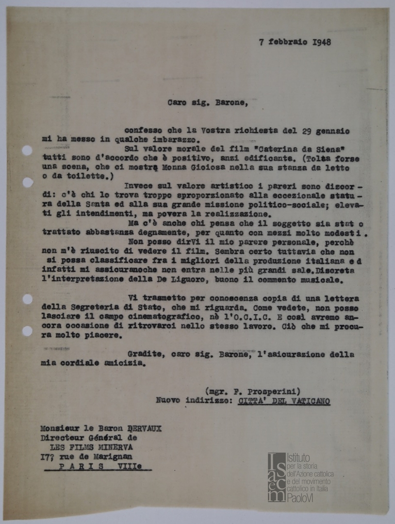 Mons. Ferdinando Prosperini risponde a Raymond Dervaux sul valore morale ed artistico del film su Caterina da Siena. Dattiloscritto