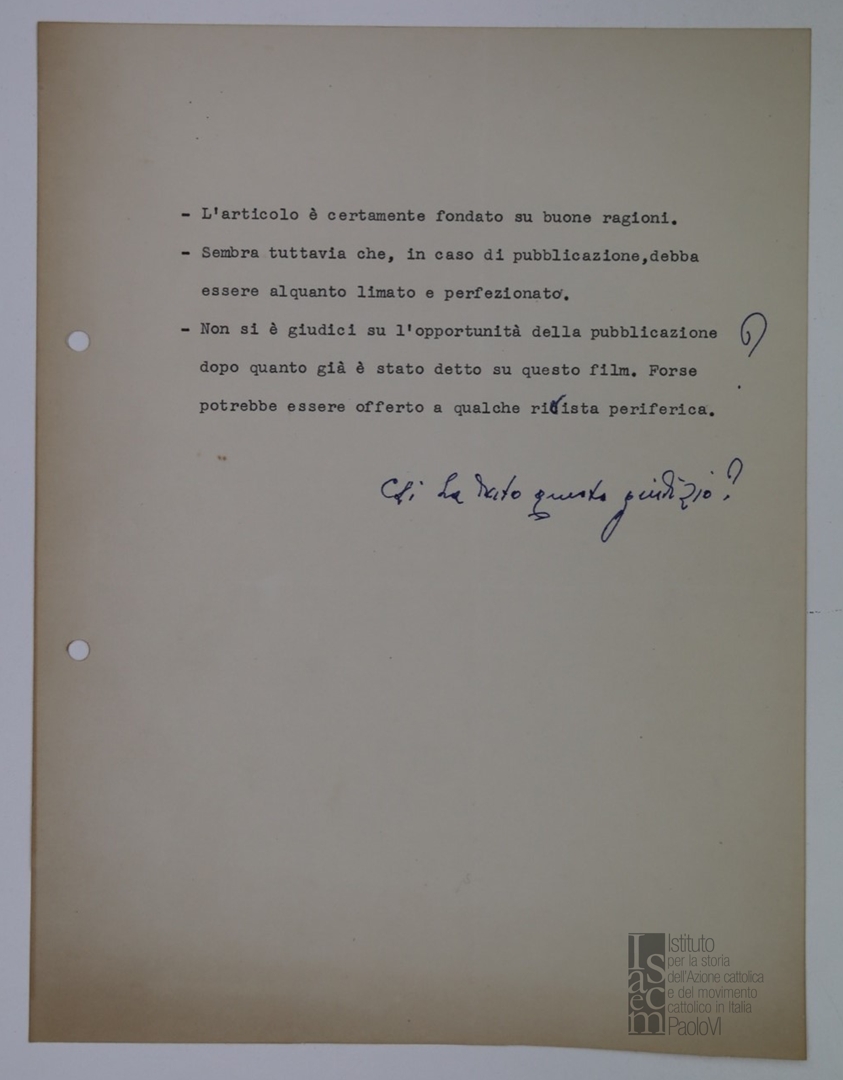 Osservazioni su un articolo di stampa a commento di un film. Dattiloscritto