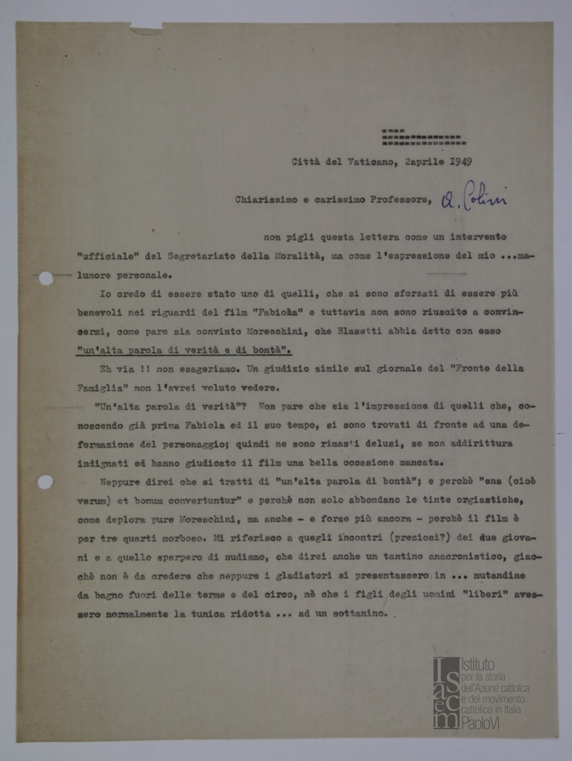 Osservazioni sull'articolo apparso sul periodico «La famiglia italiana» relativamente al film Fabiola diretto da Alessandro Blasetti. Dattiloscritto