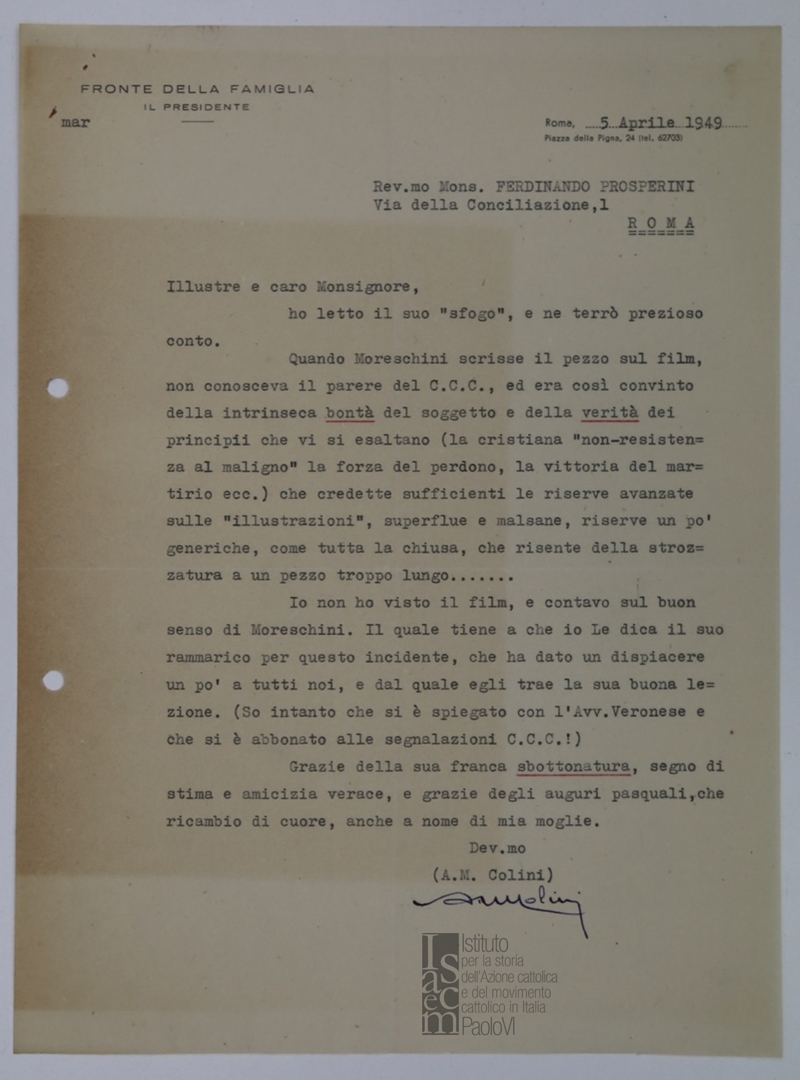 Antonio Maria Colini risponde a mons. Ferdinando Prosperini in merito al giudizio del periodico «La famiglia italiana» sul film Fabiola diretto da Alessandro Blasetti. Dattiloscritto