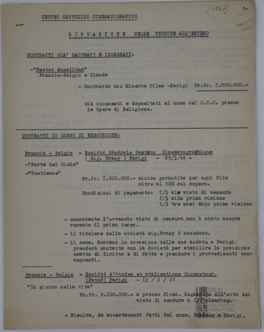 "Centro cattolico cinematografico. Situazione delle vendite all'estero"