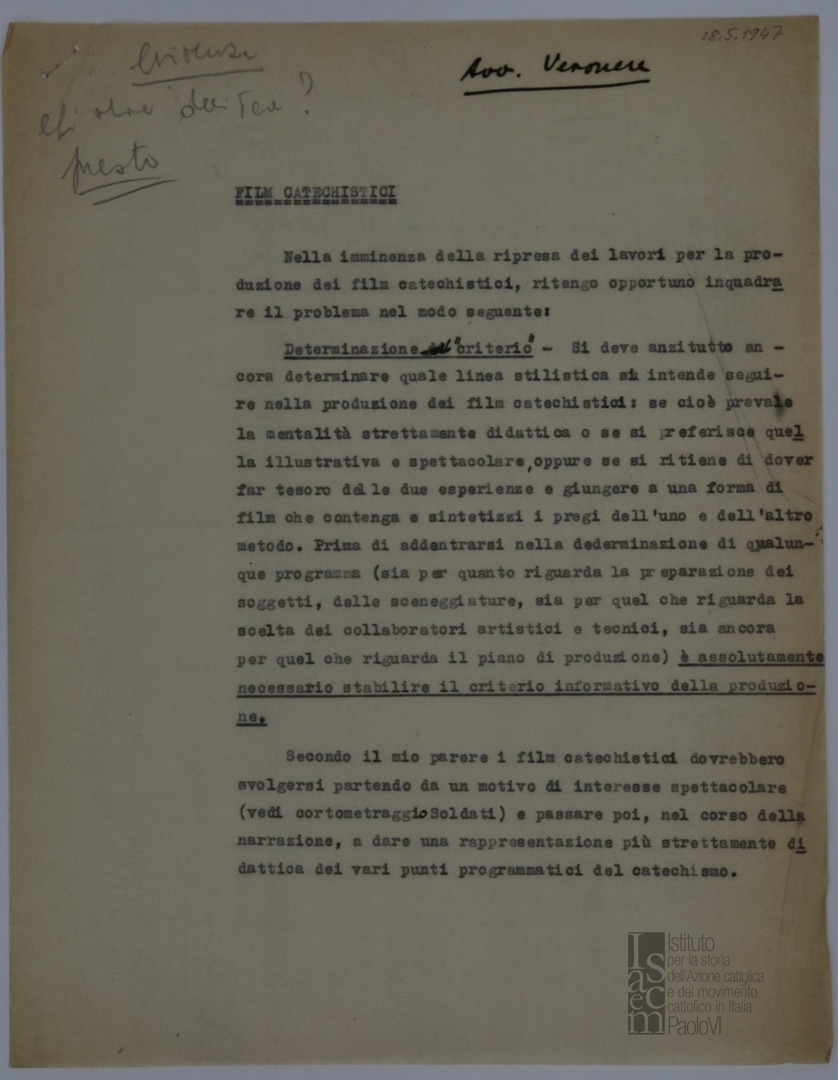 Raccomandazioni sui criteri da adottare per la realizzazione di film e cortometraggi destinati all'insegnamento catechistico. Dattiloscritto