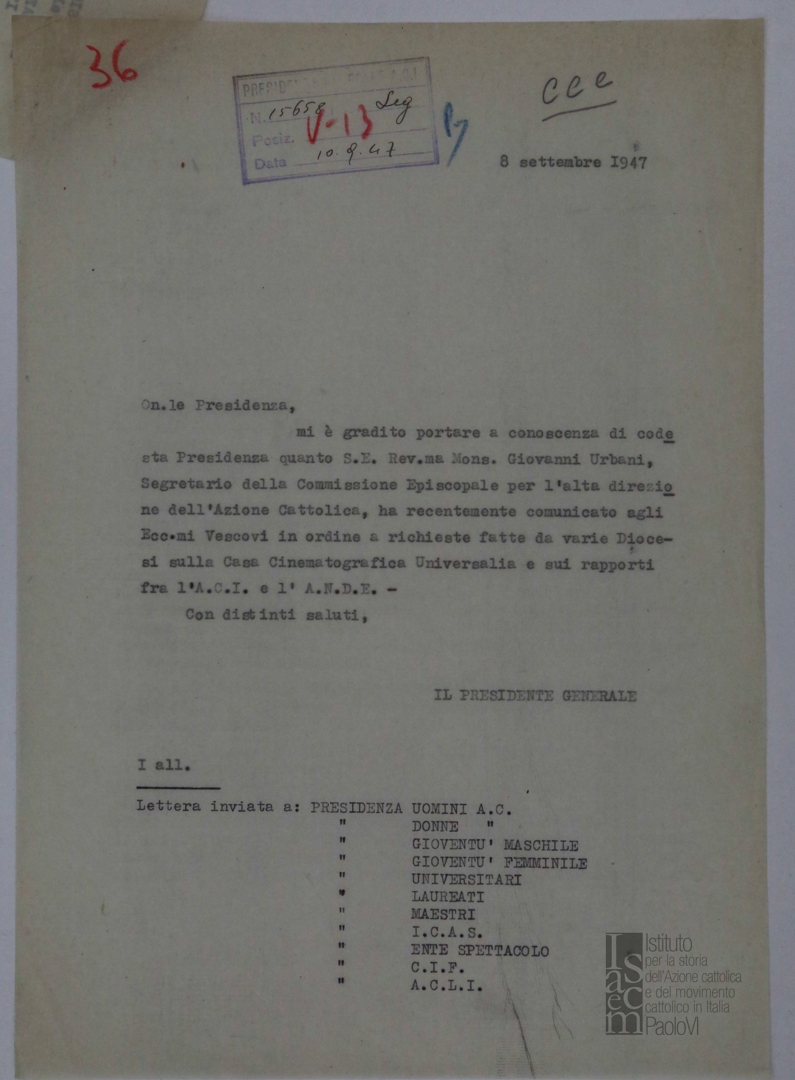 Vittorino Veronese informa la Presidenza di una comunicazione di mons. Giovanni Urbani, segretario della Commissione episcopale per l'alta direzione dell'Azione cattolica, inviata ai vescovi in ordine alle richieste pervenute da varie diocesi sulla casa cinematografica Universalia e sui rapporti tra l'ACI e l'ANDE. Dattiloscritto