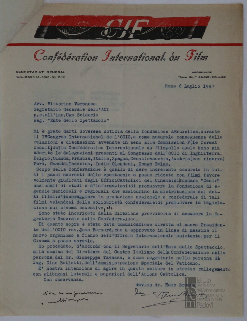 Lettera di Remo Branca, segretario generale della Confédération international du film - CIF, a Vittorino Veronese, presidente generale dell'ACI e a Ugo Sciascia, segretario dell'Ente dello spettacolo