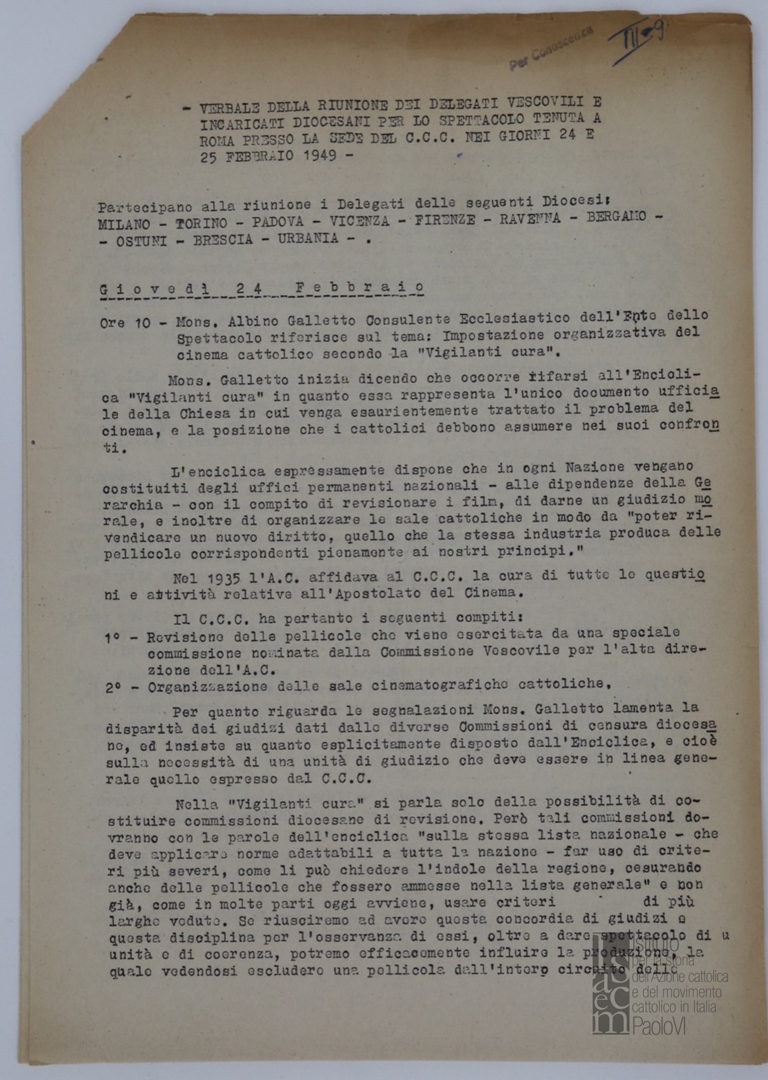 "Verbale della riunione dei delegati vescovili e incaricati diocesani per lo spettacolo tenuta a Roma presso la sede del C.C.C. nei giorni 24 e 25 febbraio 1949"