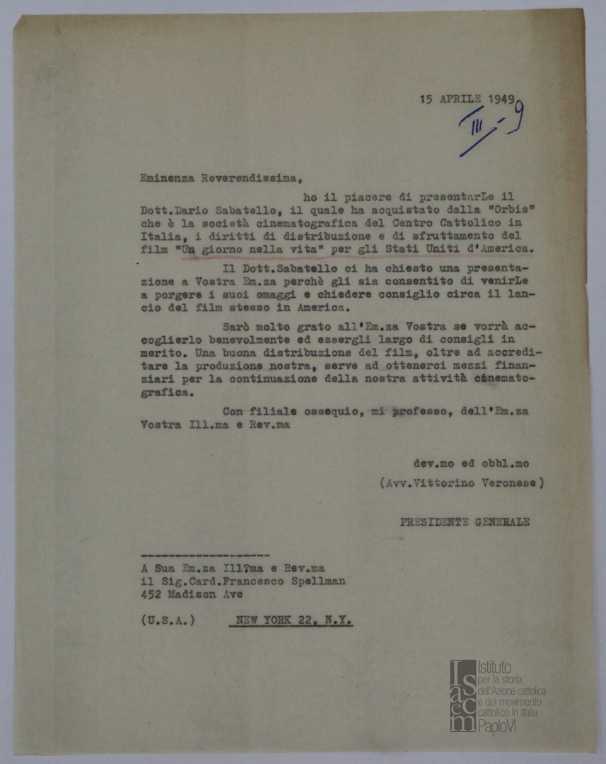 Vittorino Veronese scrive al card. Francis Spellman a proposito della distribuzione negli Stati Uniti del film Un giorno nella vita di Alessandro Blasetti. Dattiloscritto