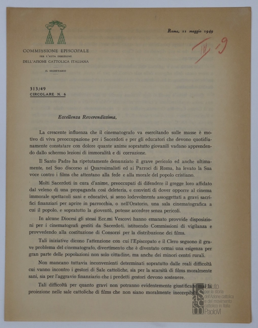 Circolare a firma di mons. Giovanni Urbani, vescovo di Assume e assistente ecclesiastico generale dell'ACI