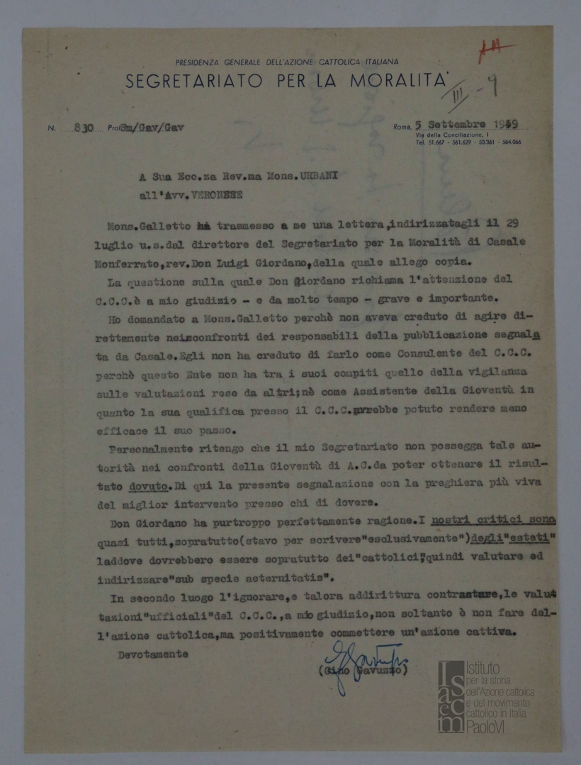 Gino Gavuzzo scrive a mons. Giovanni Urbani e a Vittorino Veronese in merito ad una segnalazione di don Luigi Giordano, direttore del Segretariato per la moralità di Casale Monferrato, riguardante la mancata osservanza delle indicazioni morali del CCC. Dattiloscritto