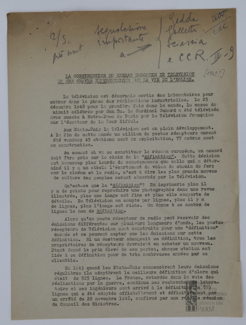 Relazione sul ruolo della televisione come nuovo mezzo di comunicazione: richiamo alla necessità di una sua regolamentazione a livello internazionale per affrontare l'impatto sul mondo cattolico. Dattiloscritto