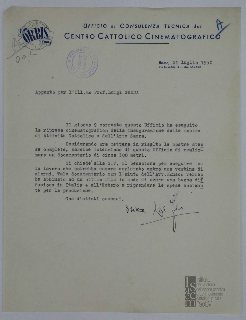 Richiesta di autorizzazione per l'esecuzione di un documentario sulle mostre di attività cattolica e arte sacra. Dattiloscritto