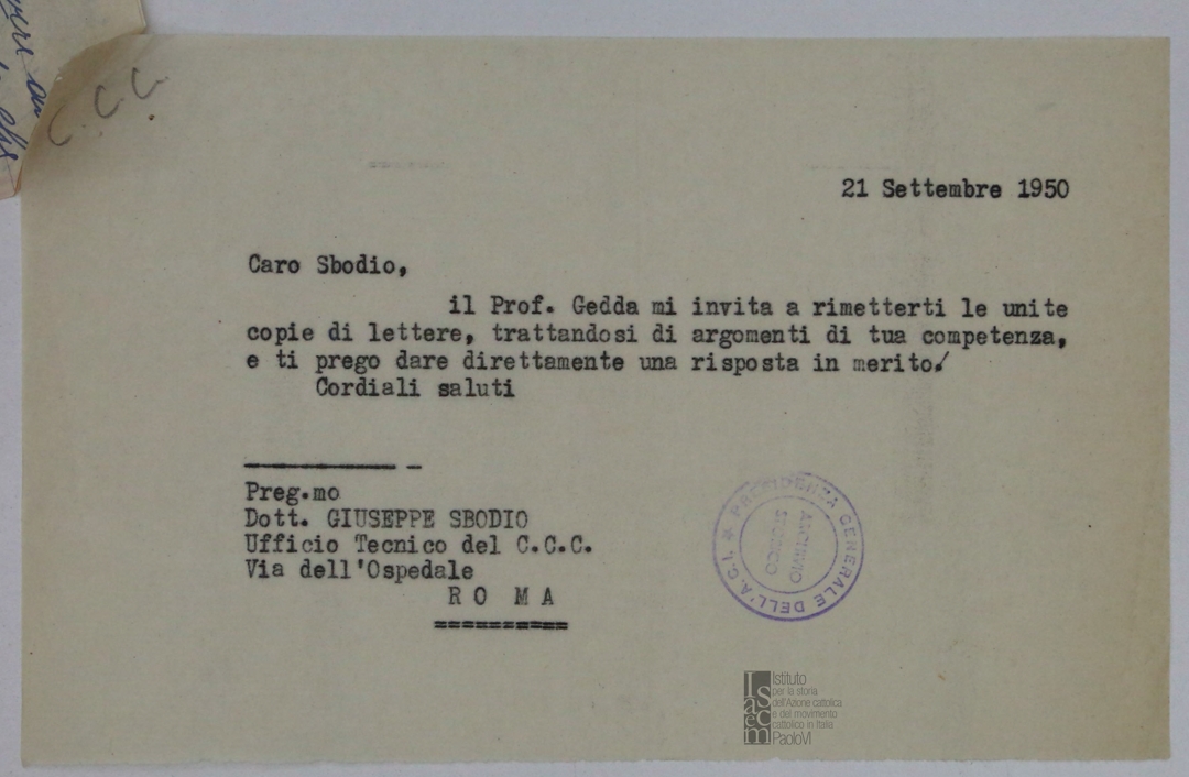 Lettera non firmata indirizzata a Giuseppe Sbodio, dell'Ufficio tecnico del Centro cattolico cinematografico - CCC