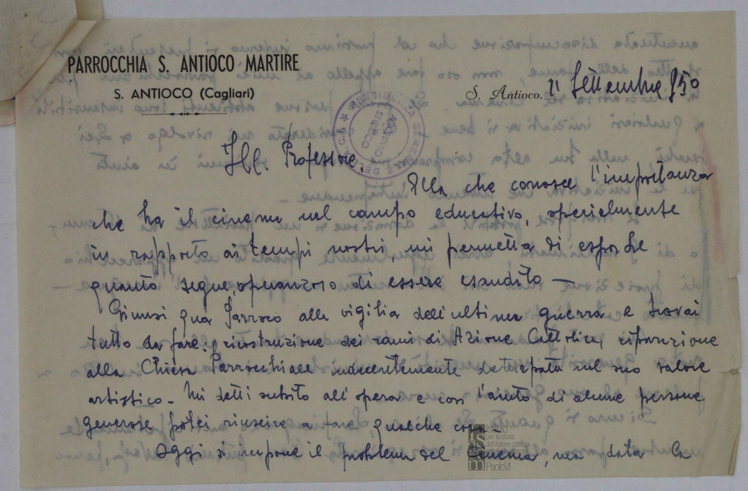 Lettera del parroco di S. Antioco Martire in provincia di Cagliari a Luigi Gedda, presidente del Centro cattolico cinematografico - CCC