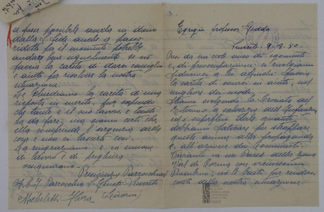 Lettera della Presidenza parrocchiale ACI della Parrocchia di S. Giusto di Suvereto in provincia di Livorno a Luigi Gedda, presidente del Centro cattolico cinematografico - CCC