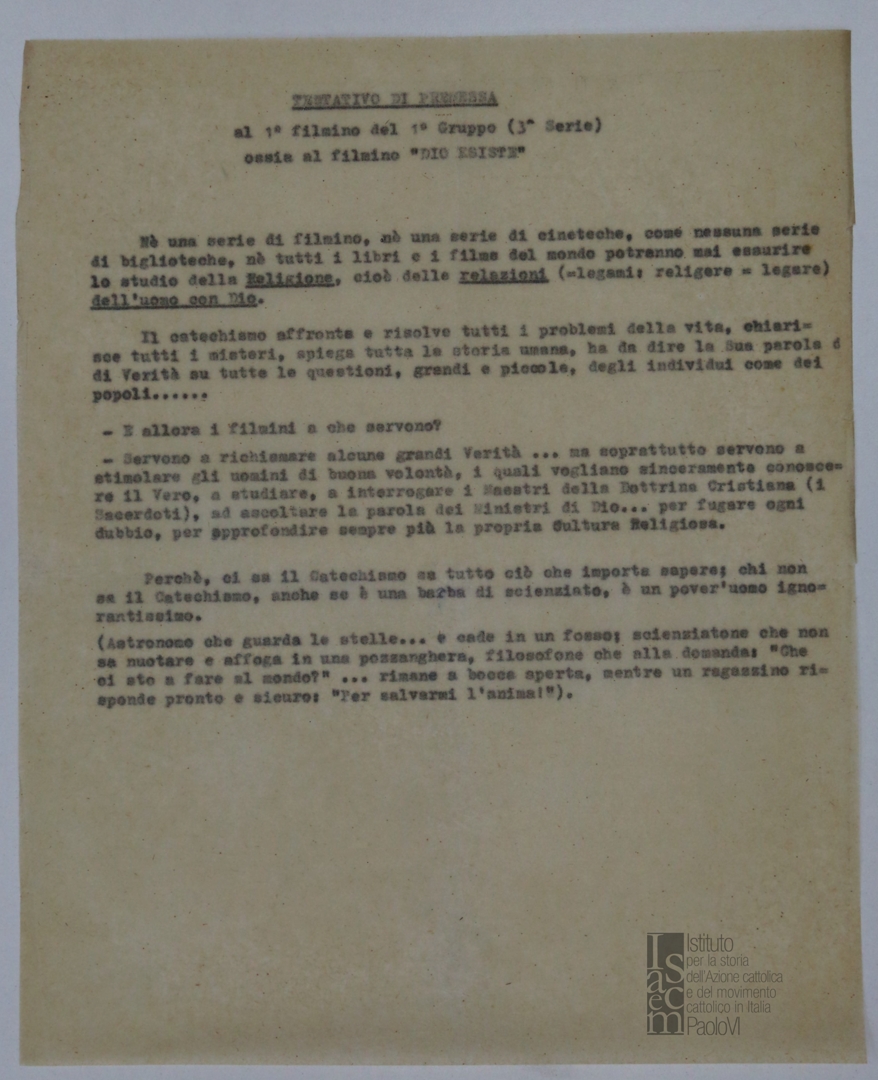 "Tentativo di premessa al 1° filmino del 1° Gruppo (3^ serie) ossia la filmino 'Dio esiste'"