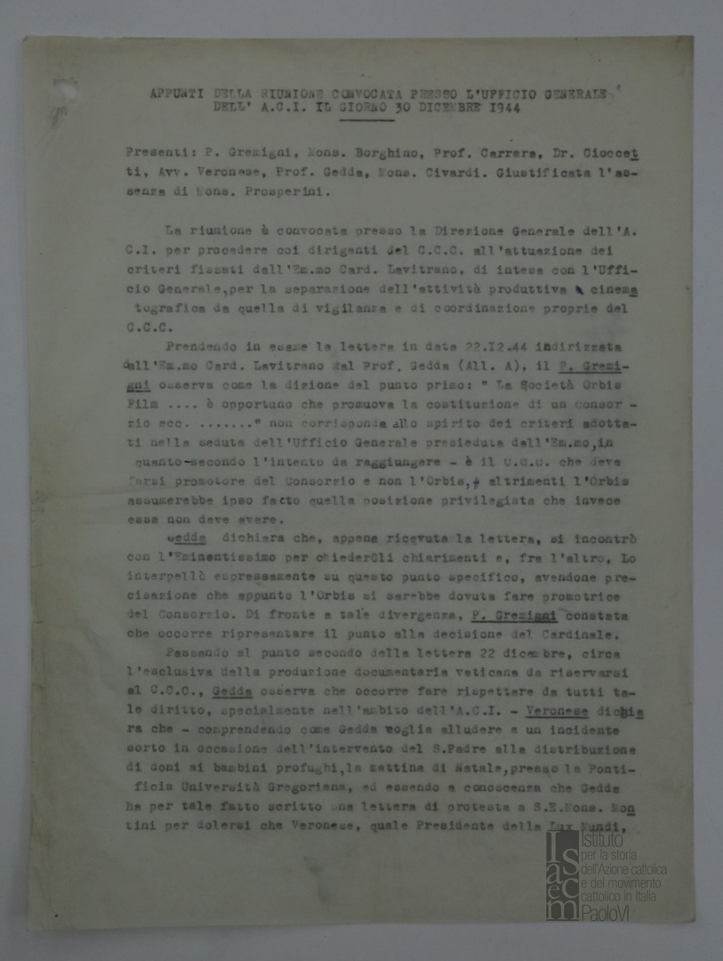 "Appunti della riunione convocata presso l'Ufficio generale dell'ACI il giorno 30 dicembre 1944"