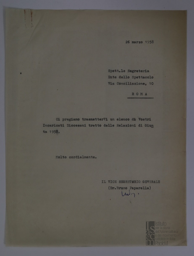 Elenco degli incaricati diocesani dell'Ente dello spettacolo tratto dalle relazioni di Giunta 1958