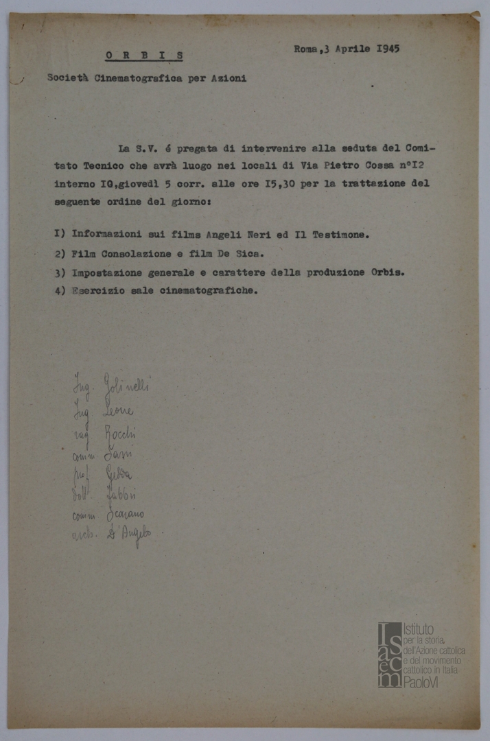 Lettera di convocazione della seduta del Comitato tecnico della Orbis del 5 aprile 1945