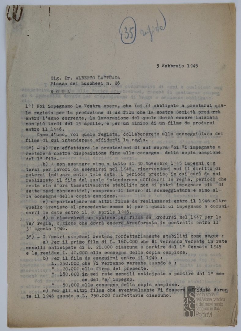 Contratto con Alberto Lattuada per la produzione di un film distribuito dalla Orbis. Dattiloscritto