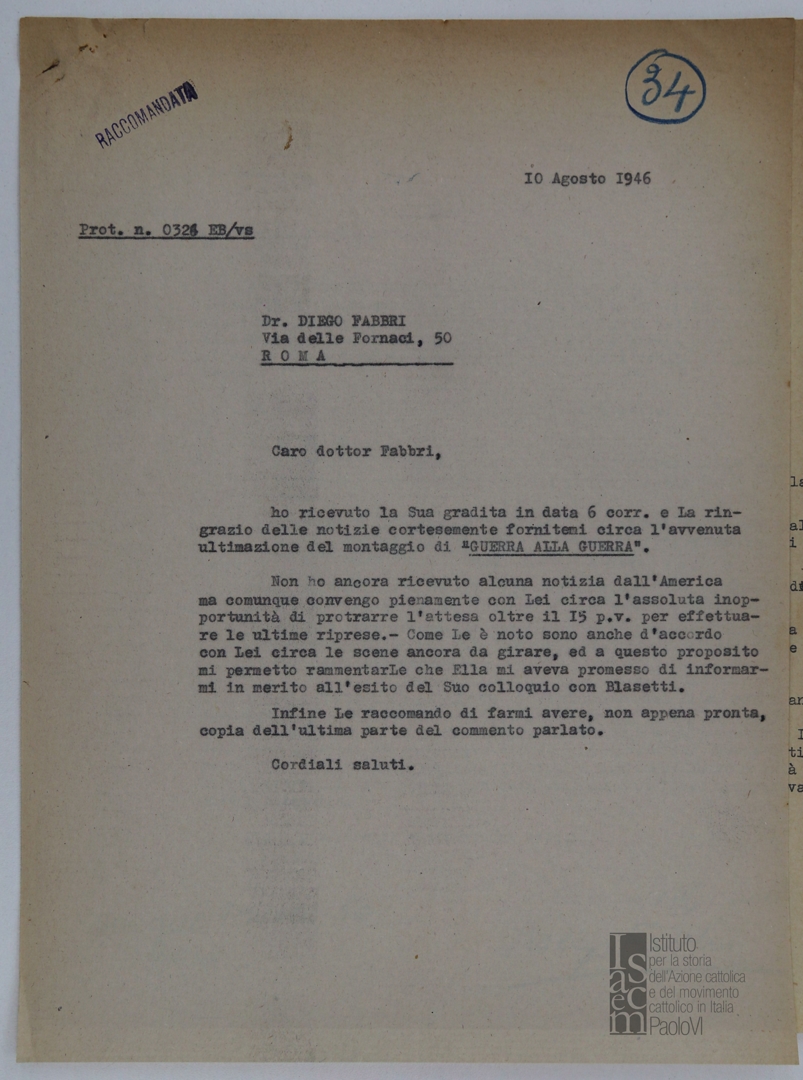 Osservazioni in merito alle riprese del cortometraggio "Guerra alla guerra". Dattiloscritto