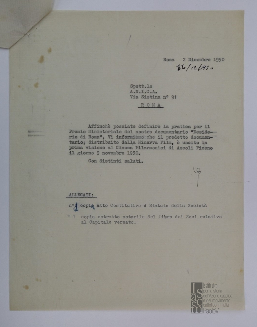 Comunicazione della proiezione del documentario "Desiderio di Roma" ad Ascoli Piceno e richiesta di perfezionamento della pratica per l'assegnazione del premio ministeriale. Dattiloscritto
