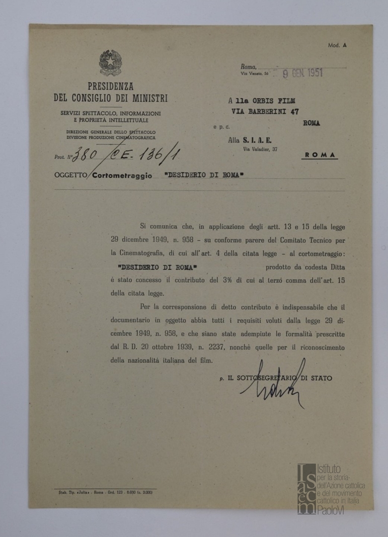 Comunicazione dell'avvenuta concessione di un contributo per il cortometraggio "Desiderio di Roma". Dattiloscritto