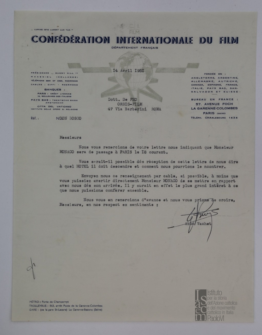 Lettera di Aloysious Vachet della Confédération internationale du Film - CIF, a Fulvio De Feo