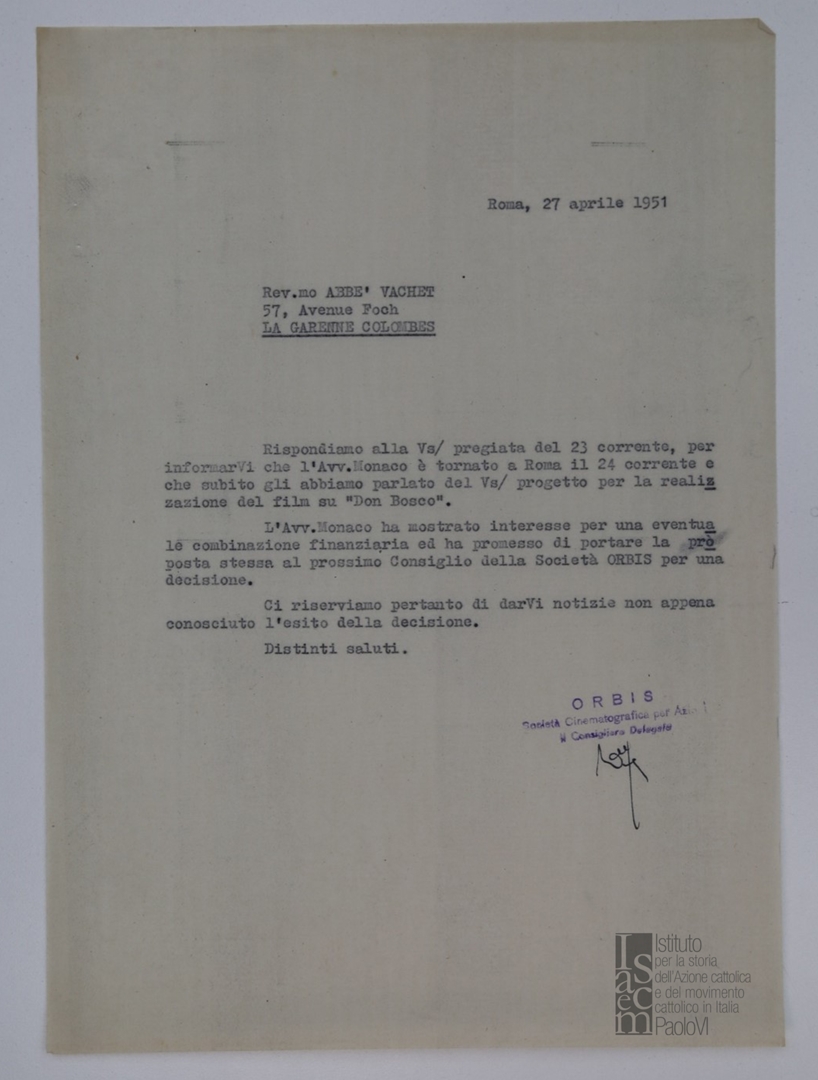 Fulvio De Feo scrive a Aloysious Vachet a proposito dell'intenzione della Orbis Film di collaborare con un finanziamento alla realizzazione del film su Don Bosco. Dattiloscritto