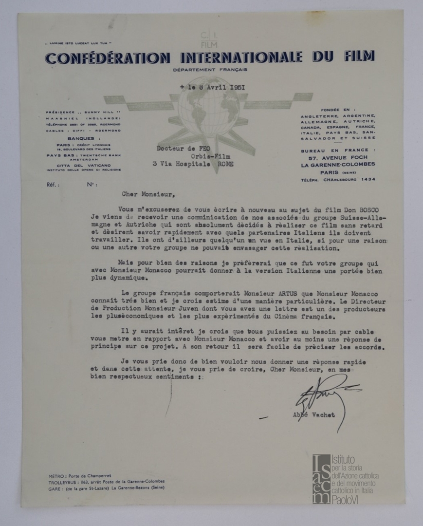 Lettera di Aloysious Vachet della Confédération internationale du Film - CIF, a Fulvio De Feo