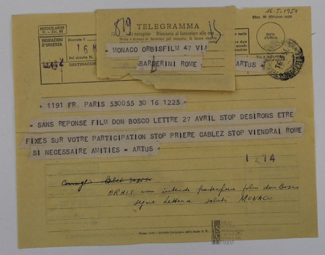 Richiesta di risposta sulla partecipazione dell'Orbis al film Don Bosco. Dattiloscritto