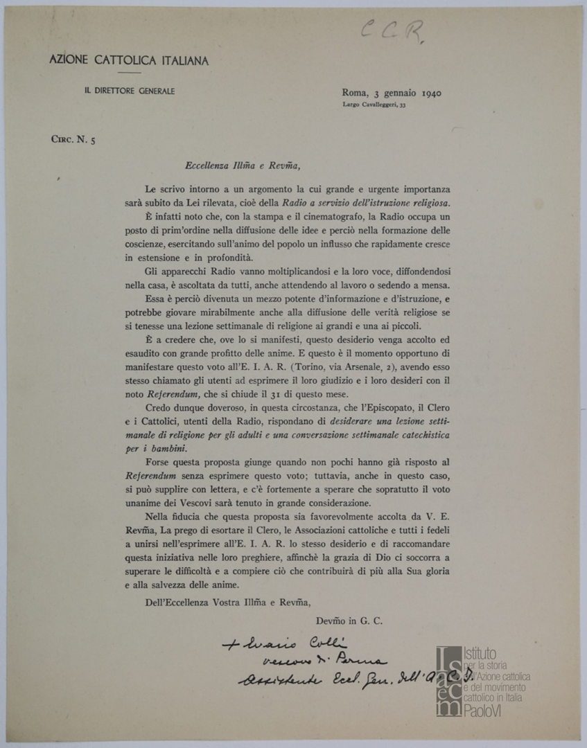 Lettera circolare a firma di mons. Evasio Colli, vescovo di Parma e direttore generale dell'ACI