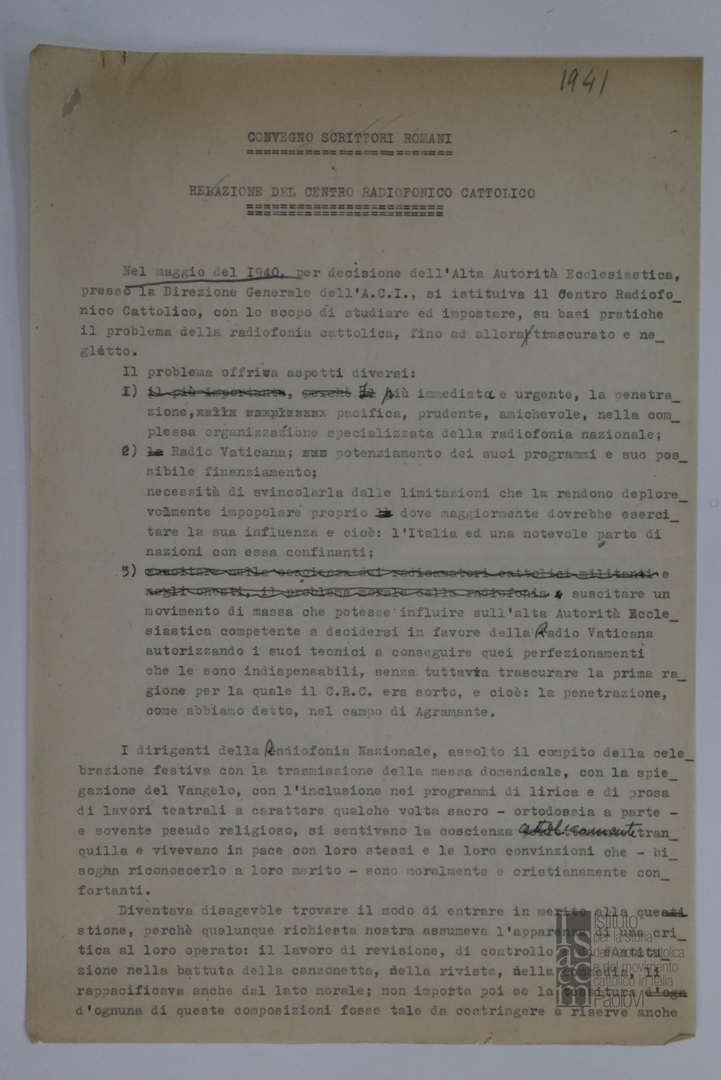 Resoconto delle attività del Centro con osservazioni sui temi della radiofonia cattolica. Dattiloscritto