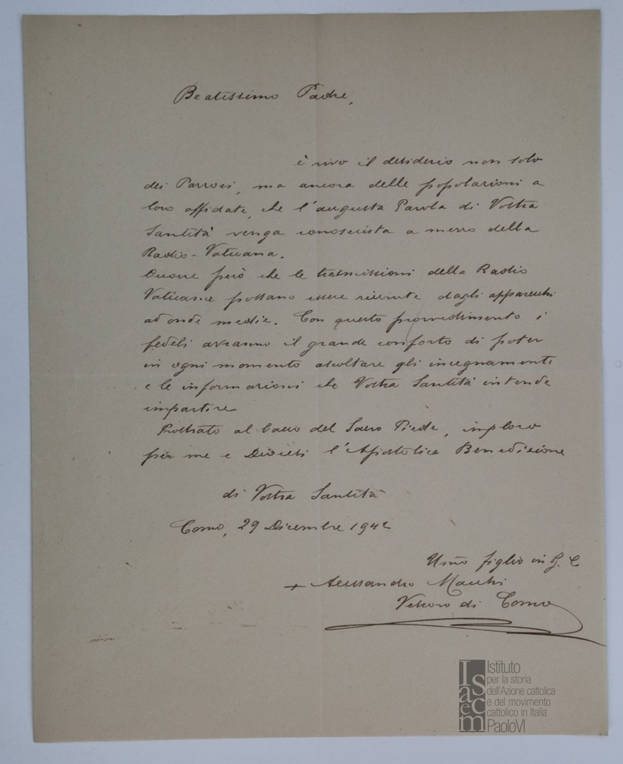 Lettera di mons. Alessandro Macchi, vescovo di Como, a papa Pio XII
