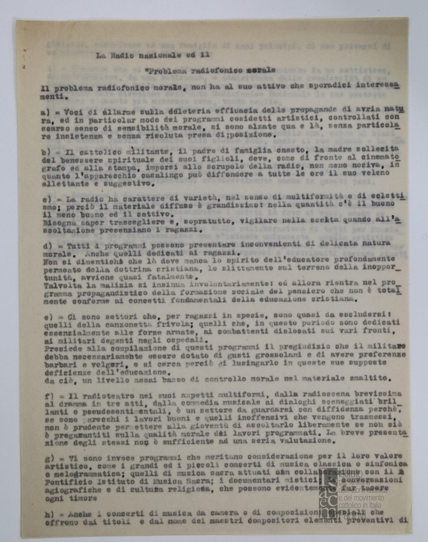 Appunto sull'importanza della vigilanza morale dei cattolici sui programmi radiofonici. Dattiloscritto