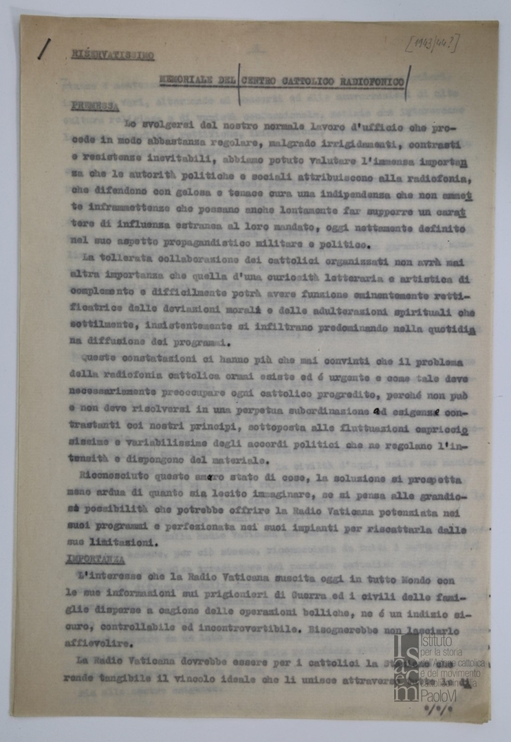 Resoconto sul problema della radiofonia cattolica e sulle potenzialità della Radio vaticana per la diffusione della morale religiosa con l'assegnazione dell'onda media. Dattiloscritto