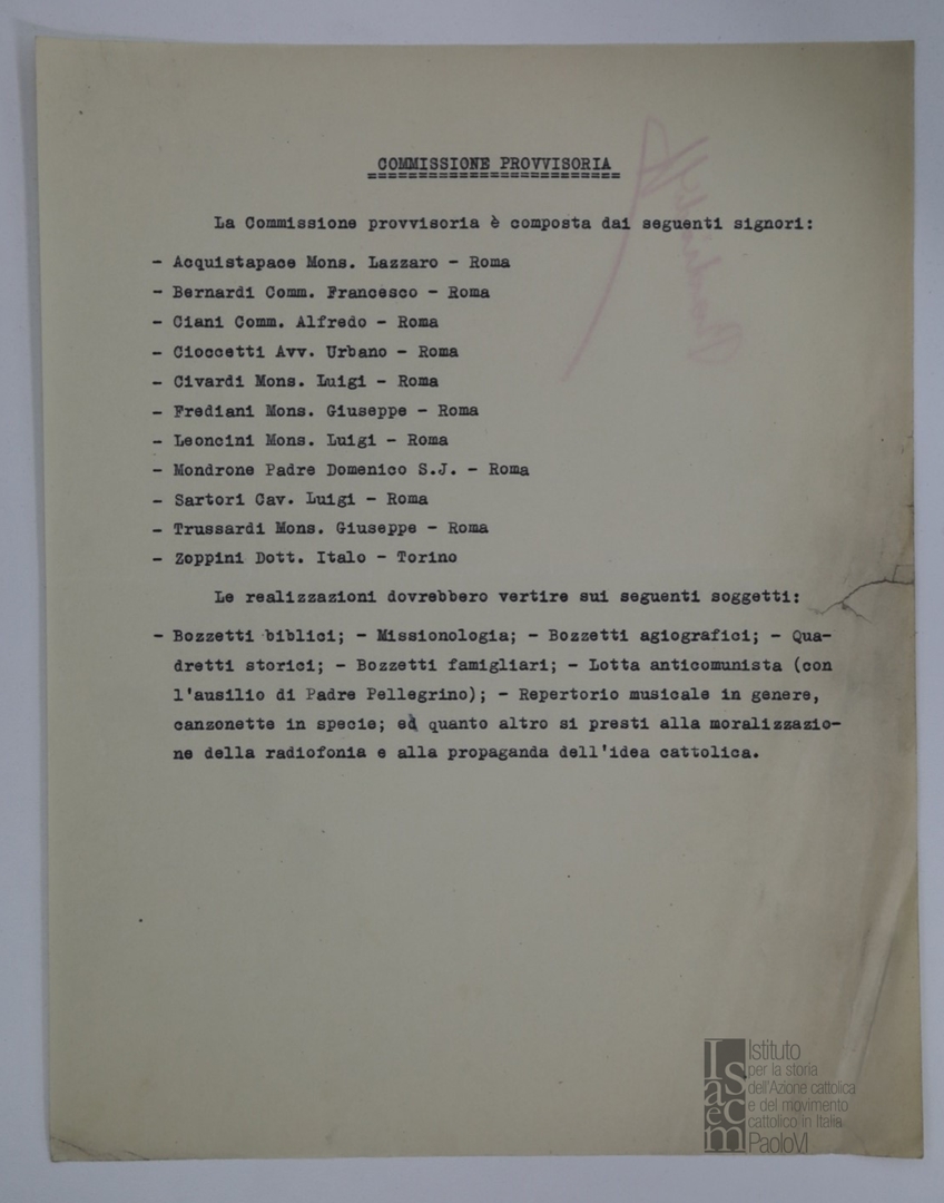 Composizione della Commissione provvisoria: elenco nominativo. Con indicazioni per la moralizzazione della radiofonia e per la propaganda del pensiero cattolico attraverso la radio. Dattiloscritto