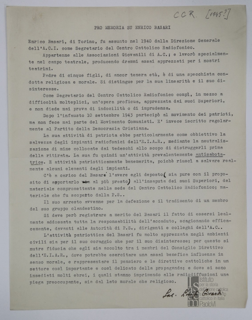 "Pro memoria su Enrico Basari", a cura di Luigi Civardi