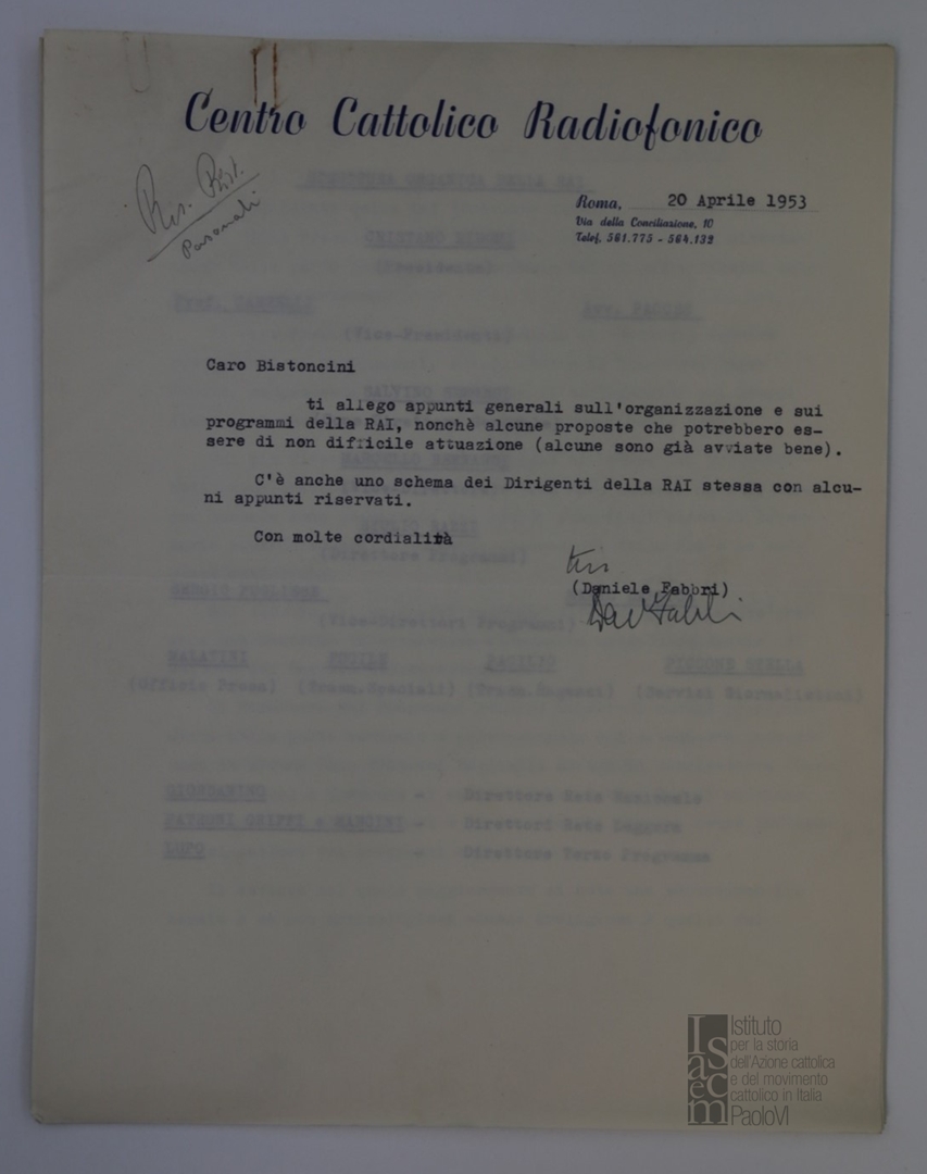 Con lettera di trasmissione di Daniele Fabbri, segretario del Centro cattolico radiofonico - CCR, a Bistoncini. Dattiloscritto