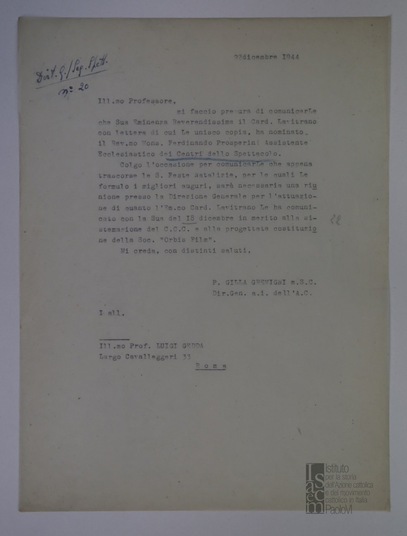 Mons.Gilla Vincenzo Gremigni comunica a Luigi Gedda la nomina di mons. Ferdinando Prosperini ad assistente ecclesiastico del Centri dello spettacolo e preannuncia una riunione per l'esame della situazione del CCC e del progetto di costituzione della società Orbis Film. Dattiloscritto