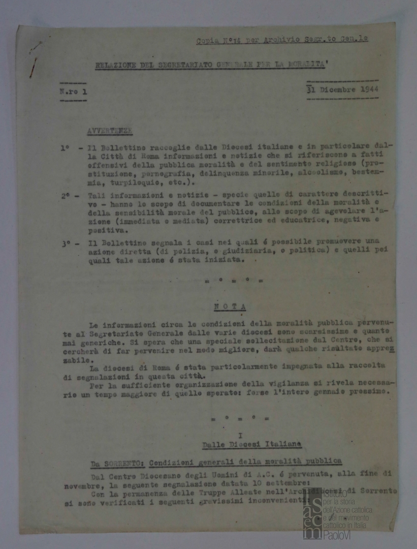 "Relazione del Segretariato Generale per la Moralità. Nr. 1"